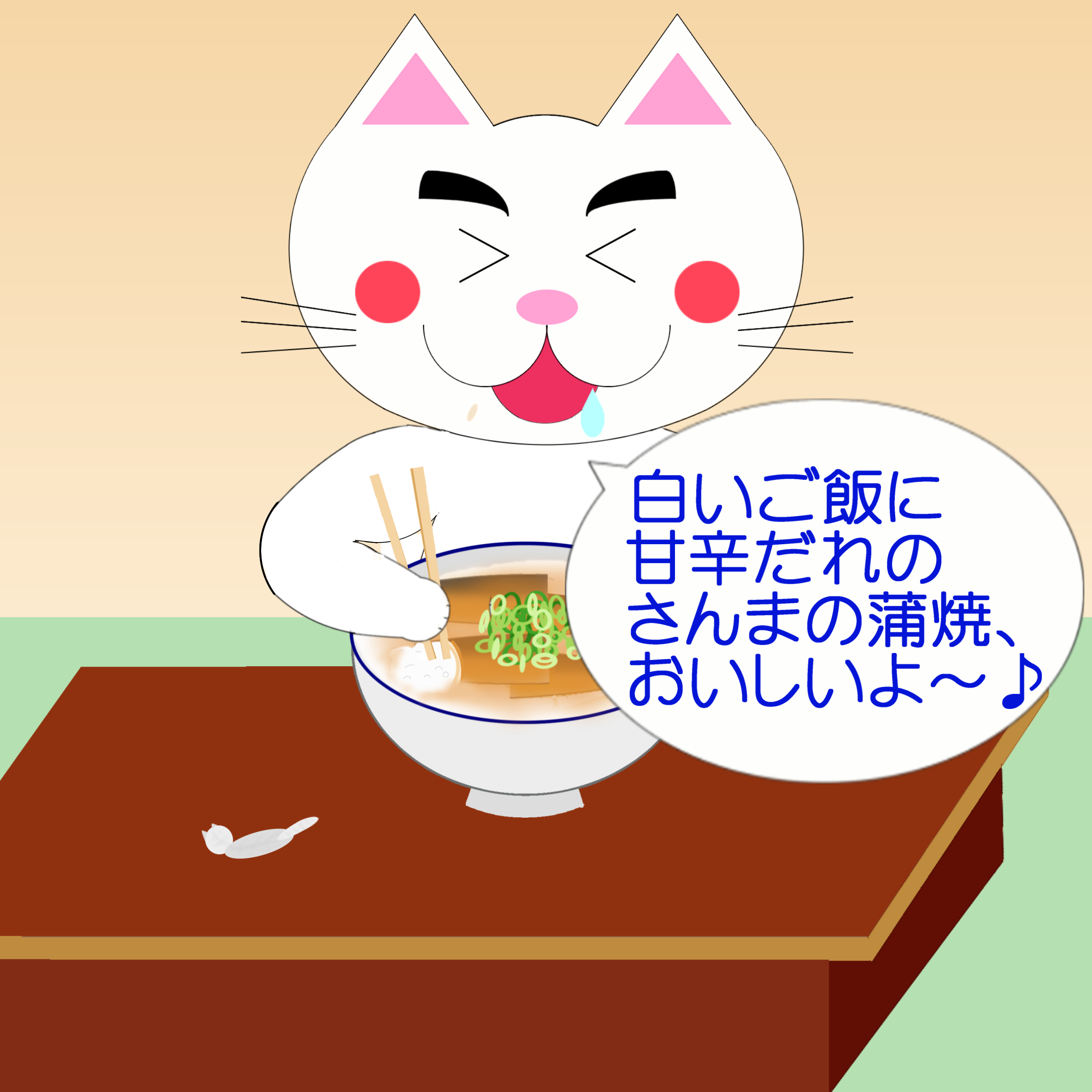 「白いままさ甘辛だれのさんまのかばやぎ、めどぉ~♪」津軽弁解説 ワンポイント方言/津軽弁-アーカイブ X コピー 2025.09.26 「なまねご」のワンポイント方言の解説イラスト・津軽弁監修:渡部航佑 2025.09.19公開津軽弁:「白いままさ甘辛だれのさんまのかばやぎ、めどぉ~♪」標準語:「白いご飯に甘辛だれのさんまの蒲焼、おいしいよ~♪」 イラスト:さんまの蒲焼丼を食べるレオ君◇解説2コマ目めぇ~♪⇒意:うま~♪ まま⇒意:ご飯 かばやぎ⇒意:蒲焼(かばやき) ※濁点が付いただけめ⇒意:おいしい、うまいめどぉ⇒意:おいしいよ、おいしいぞ